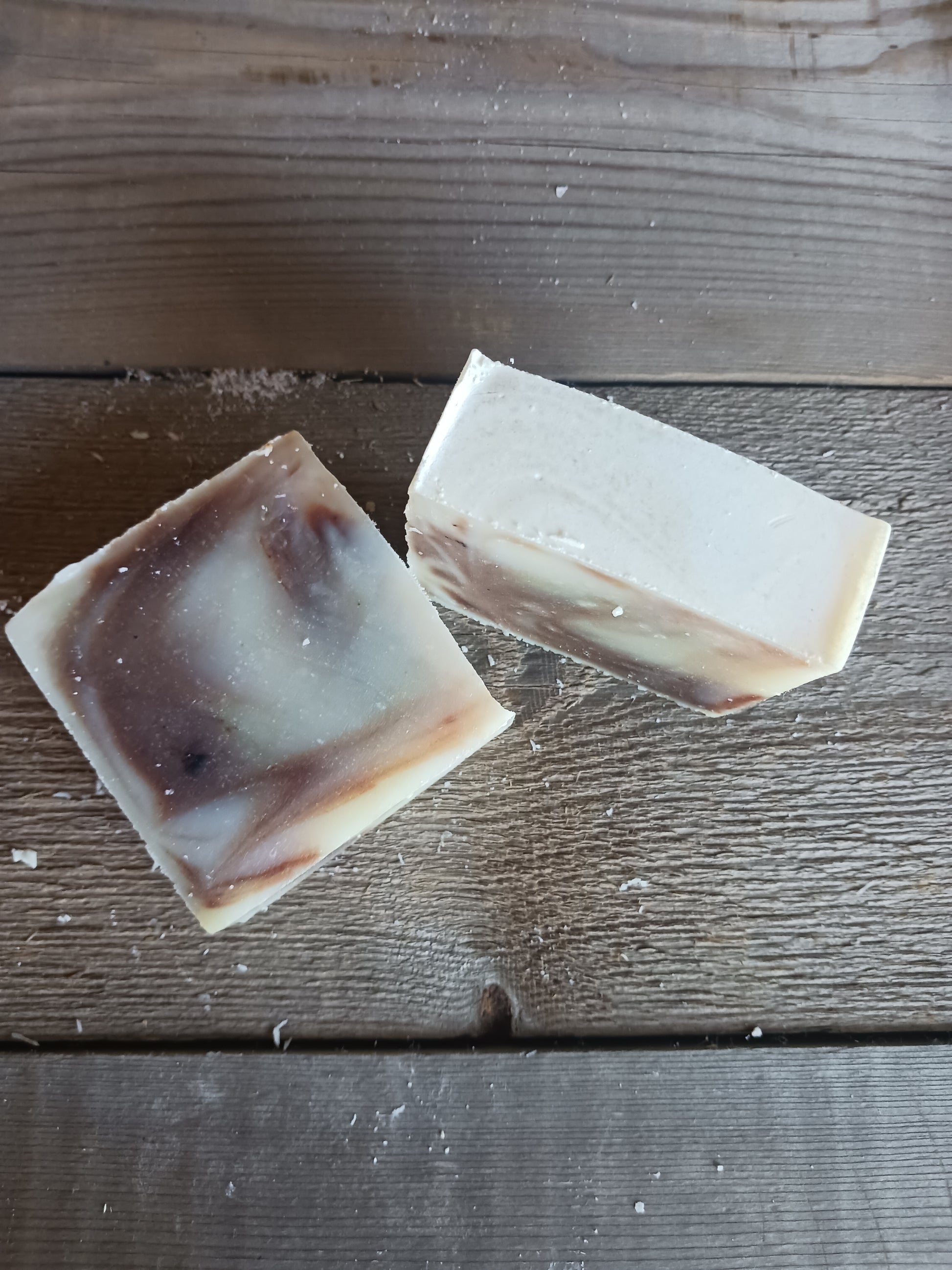 Coconut oil, olive oil, distilled water, sodium hydroxide, castor oil, peppermint essential oil, cocoa powder, spirulina powder.