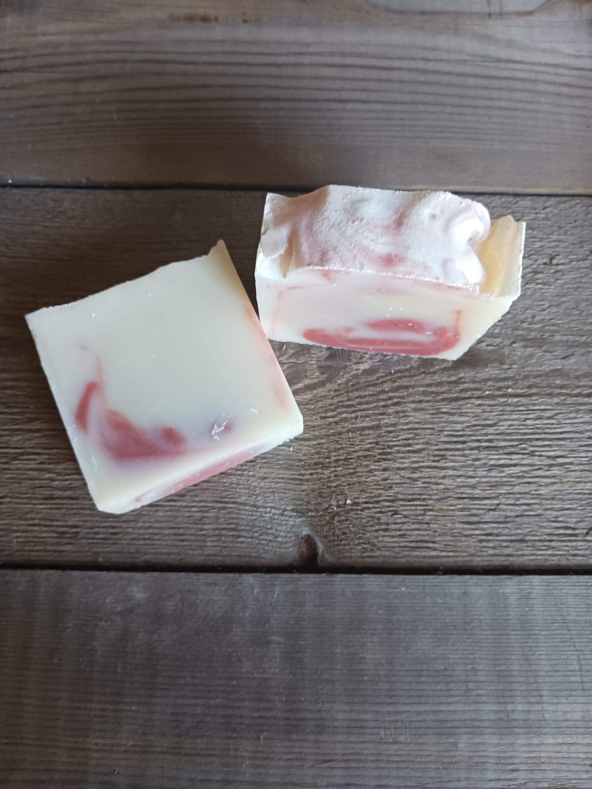 Coconut oil, olive oil, water, sodium hydroxide, castor oil, rose clay, rose essential oil.